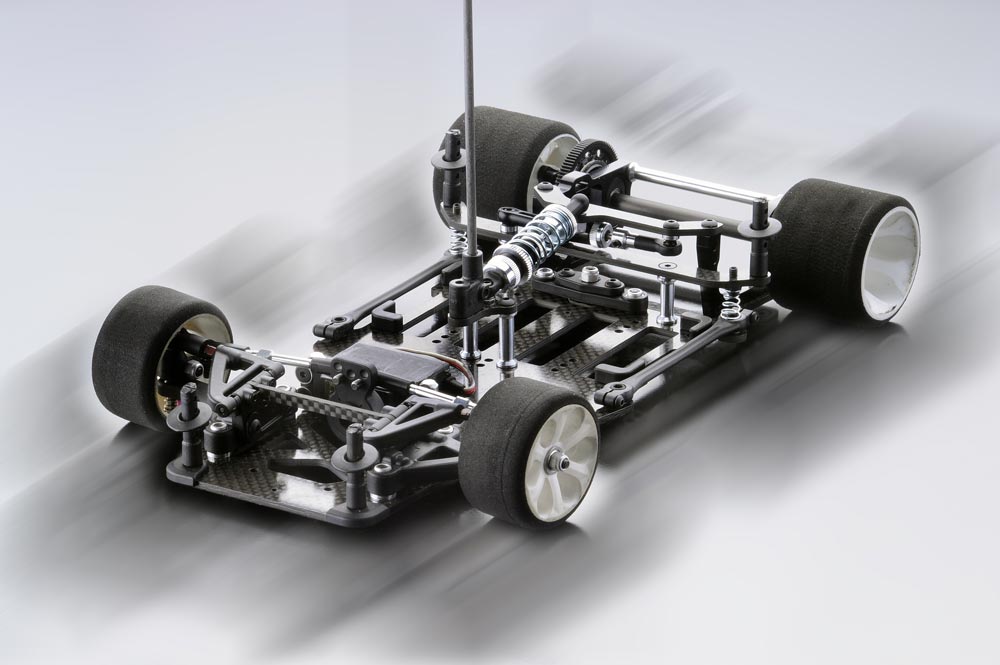 Die beiden Achshälften werden durch eine Kohlefaserstrebe miteinander verbunden. Es gibt statt dessen auch ein Option Part aus Aluminium, hier ist die Festigkeit einstellbar. Der Radsturz ist je nach Schliff der Reifen einzustellen, gebräuchlich sind hier ca. -1,0 bis -1,5° .