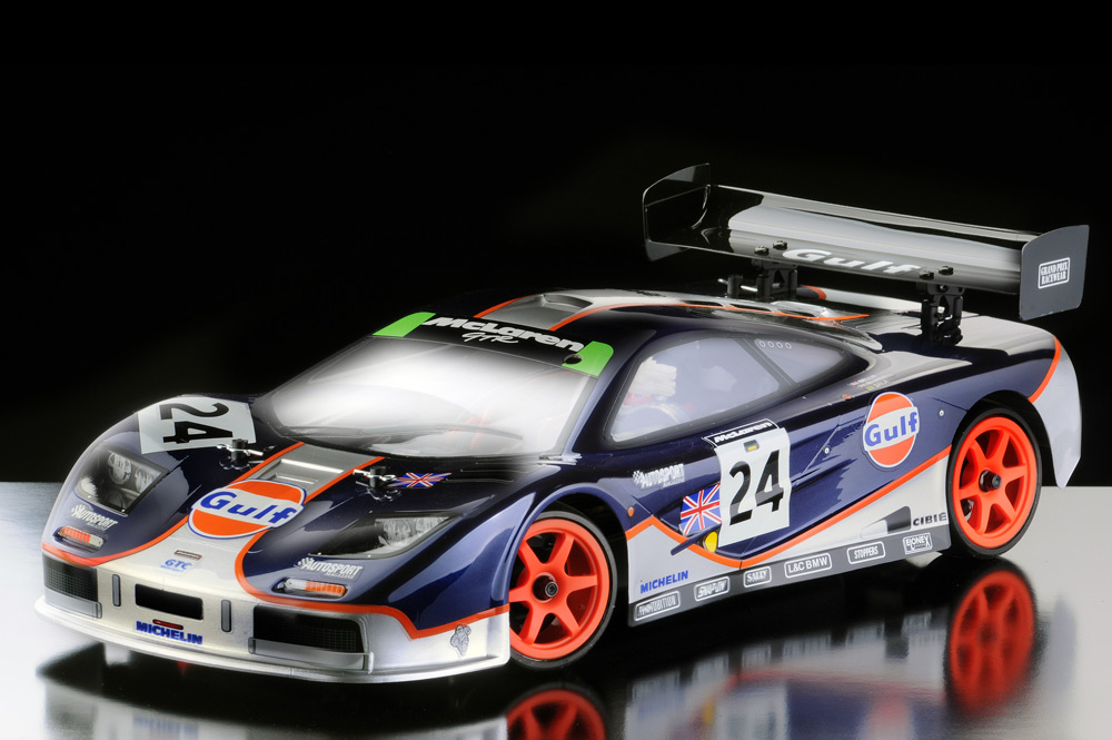 Der EP-Fazer ist als Ready-to-run Modell mit drei verschiedenen Karosserievarianten erhältlich. So gibt es ihn als Aston Martin DBR 9 2008, als Porsche 911 GT3 RSR oder wie hier besprochen, als den Klassiker McLaren F1 GTR Gulf.