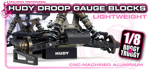 leichten Chassisböcke von HUDY genutzt werden. Hiermit ergibt sich ein reproduzierbarer Abstand zum Unterboden (30 mm) und der Fahrer erhält somit immer exakte Messergebnisse. Zur Gewichtserleichterung wurden die Böcke zusätzlich stark ausgefräst. Diese Chassisböcke sind im Zusammenspiel mit Bestellnummer 107717 zum präzisen Ausmessen des Federwegs nutzbar.