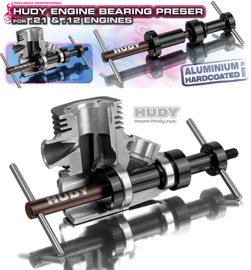 | | Das neue HUDY- Hilfstool für einen einfachen Lagerwechsel bei einem Nitromotor ist für Motoren von 2,11 Kubikzentimeter Hubraum oder für die größeren 3,5-Kubikzentimeter-Motoren erhältlich. Es ermöglicht das Entfernen sowohl der vorderen wie auch der hinteren Lager. Das Einpressen der neuen Lager wird mit diesem Tool erheblich vereinfacht und man erhält einen optimalen Lagersitz im Gehäuse. Unter Bestellnummer 107050 ist der Werkzeugsatz für 2,11er-Motoren erhältlich und unter Bestellnummer 107051 kann man den Satz für 3,5er-Motoren erwerben.