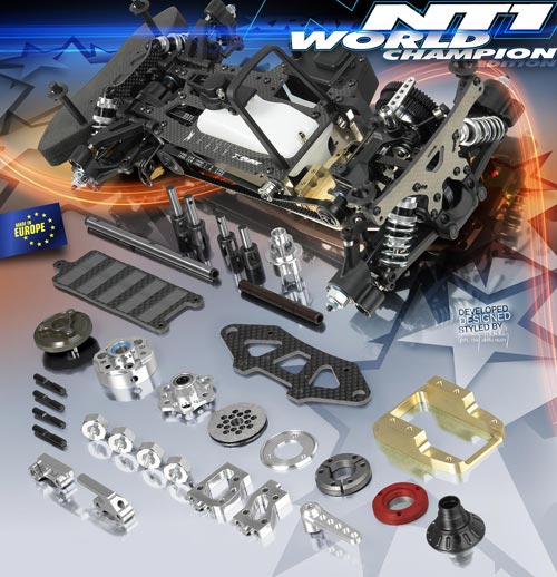 | | Anlässlich des Gewinns der ersten Weltmeisterschaft durch den NT1 bringt XRAY eine mit sehr vielen Tuningteilen ausgestattete Sonderedition des NT1 heraus. Neben einem kompletten Chassis gehören folgende Tuningteile zum Paket des NT1: