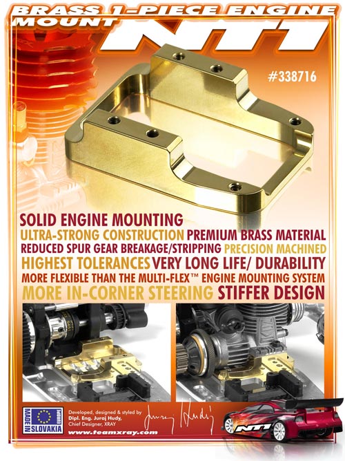 | | An manchen Stellen lässt sich nur schwer das eventuell benötigte Zusatzgewicht auf dem Chassis unterbringen. Abhilfe und zugleich eine stabilisierende Wirkung schafft hier der neue, aus einem Stück CNC-gefräste Motorhalter aus Messing für den NT1. Durch das zusätzliche Gewicht von 26 Gramm wird zum einen weniger Ausgleichsgewicht benötigt und zum anderen erhöht die Montageposition des zusätzlichen Gewichts die Kurvengeschwindigkeit beim Kurveneingang.