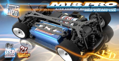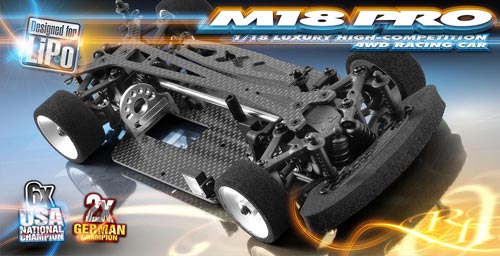 | | Der erfolgreiche 1:18 Mini Tourenwagen M18 erhält nun in einer speziellen LiPo-Version neue Teile. Diese dienen in erster Linie der Halterung von LiPo-Hardcase-Akkus, wie sie auf den Rennen vorgeschrieben sind. Natürlich wurde dem veränderten Gewicht ebenso Rechnung getragen, wie auch dem mit der neuen Akkutechnik einhergehende Leistungsschub.