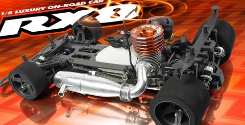 | | Zur Internationalen Spielwarenmesse wurde der lang ersehnte 1:8er Glattbahn Prototyp RX8 endlich enthüllt. Die Mannschaft um Juraj Hudy hat ein wirklich komplettes Paket herausgebracht. Am RX8 lassen sich nahezu alle Parameter direkt aus dem Baukasten heraus einstellen. Das Design der kompletten Neukonstruktion ist kompromisslos auf Sieg getrimmt. So werden nur optimale, sehr leichte und stabile Materialien verwendet. Zusammen mit einem unverwechselbaren Mix aus cleveren Detaillösungen stellt dieses Auto eine echte Hürde für alle anderen Fahrer dar.