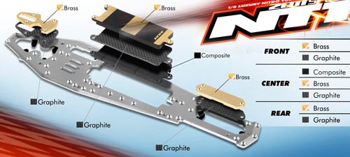 | | Zur weiteren Verbesserung des XRAY NT1 kommen nun kleine Gewichte zum Einsatz. Was zunächst ungewohnt klingen mag, entpuppt sich beim näheren Betrachten der neuen Chassisplatte der 2011er-Version als sehr gute Setup-Option. Aussparungen in der Chassisplatte ermöglichen die Montage von Messinggewichten zum Austrimmen der Chassisbalance. Außerdem können aber auch Carbonplatten zum Schutz vor Schmutz beziehungsweise zur Versteifung an derselben Stelle montiert werden.