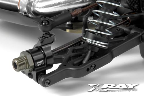 | | Das Rollcenter kann nun beim XB808 auch radseitig verändert werden. Die neuen hinteren Radträger aus 7075 T6-Aluminium ermöglichen die Montage der Kugelköpfe an drei Positionen und neben diversen Unterlegscheiben lassen sich auch die Kunststoffeinsätze zur Befestigung am Querlenker zur Einstellung des Rollcenters nutzen. Nebenbei erhöht sich die Festigkeit der Radträger im Vergleich zu den Kunststoffteilen deutlich. Der Lieferumfang beinhaltet neben den oberflächengehärteten Radträgern auch die Kunststoffeinsätze für die Kugellager und alle benötigten Kleinteile zur Montage am XB808.