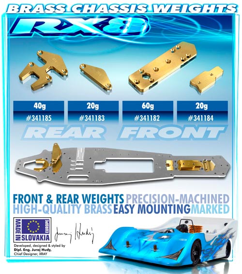 | | Um die Balance des RX8 Chassis feiner einstellen zu können, lassen sich nun neue Messinggewichte nutzen. Diese sehr passgenau gefertigten und mit Befestigungspunkten versehenen Gewichte ermöglichen die optimale Balance des RX8. Es sind folgende Varianten lieferbar: