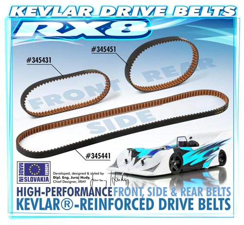 | | Die neuen Kevlar verstärkten Riemen für den Xray RX8 ermöglichen eine optimale Kraftübertragung bei enormer Lebensdauer und sind daher für einen leistungsstarken Motor optimal geeignet. Lieferbar sind folgende drei Riemen: