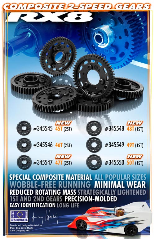 | | Passend zu den neuen Motorritzeln sind für den RX8 nun auch aus faserverstärktem Kunststoff gefertigte Hauptzahnräder erhältlich. In die Seite wurde die Zähnezahl zur besseren Identifikation eingelassen. Diese extrem rund laufenden Zahnräder gibt es folgende Abstufungen: