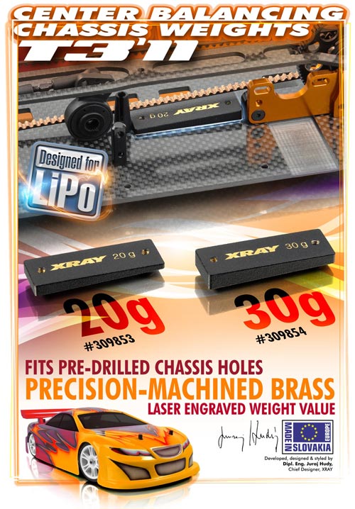 | | Um die Balance des T3-LiPo Chassis feiner einstellen zu können, lassen sich nun neue Messinggewichte nutzen. Diese sehr passgenau gefertigten und mit einem Befestigungspunkt versehenen Gewichte ermöglichen die optimale Balance des T3 LiPo. Es sind folgende Varianten lieferbar: