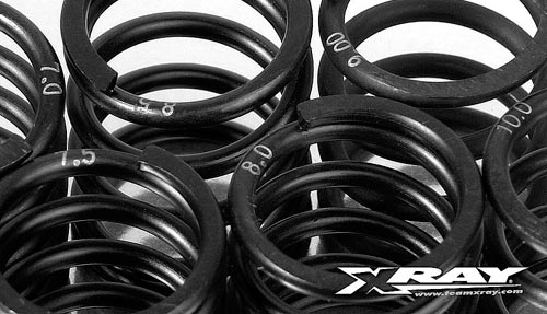 | | Der RX8 ist ein Highend- Wettbewerbsmodell, das sich optimal auf jede Strecke einstellen lässt. Um gerade die sehr wichtige Einstellung der Dämpfer verfeinern zu können, sind nun diverse neue Dämpferfedern für den RX8 erhältlich. Zur leichteren Identifikation sind die Werte in den oberen Teil eingraviert. Je weniger Windungen, desto härter sind die Federn.