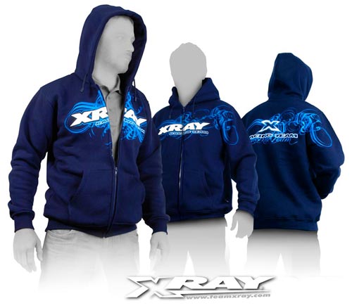 | | Wer sich mit dem Style und dem unverwechselbaren Design der Kleidung von XRAY zeigen möchte, hat mit der neuen Kapuzenjacke nun die Gelegenheit. Gefertigt aus hochwertigem Material (100 Prozent Baumwolle) kommt die Jacke im stylischen Dunkelblau daher. Die Ärmelenden sind mit elastischem Material gefüttert und dichten gut ab. Lieferbar sind die neuen XRAY-Teamjacken in folgenden Größen: