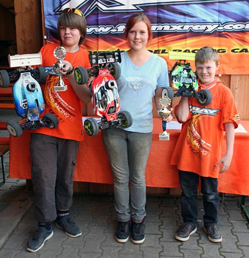 Im Jugendfinale startete Vanessa von Startplatz 2 und fiel leider einige Plätze durch eine Startkollision zurück. Im Laufe der ersten Runden konnte sie sich wieder nach vorne vorkämpfen bis auf Platz 1. Diesen konnte sie über die komplette Zeit halten beendete den Jugendlauf mit 2 Runden Vorsprung. Auf Platz 2 landete Ruben Streb mit seinem Xray 808 und auf Platz 5 David Streb mit seinem Xray XB9.