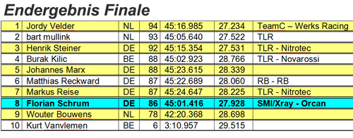 Immer noch leicht geschockt starteten wir von Platz 10 im Finale. Wir hatten uns bei dem 45 Minuten dauernden Finale für eine 9 Minuten Tankstop Strategie entschieden. Florian gelang es schnell bis auf Platz 4 vorzufahren. Den ersten Tankstop haben wir bei 9.08 durchgeführt, unverändert kämpfte Florian danach mit Burak Kilic und Markus Reise um Platz 4, 5 und 6. Vor dem 2. Boxenstop passierte es dann. 3 Meter vor der Zielschleife und 10 Meter vor der Boxeneinfahrt ging der Motor mit leerem Tank aus. Das kostete Florian 2 Runden und der Traum von einer vorderen Platzierung war aus, er beendete das Rennen auf Platz 8.
