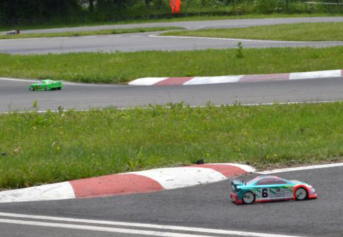Am Freitag bekam ich von Phillip die ersten Zeiten am Telefon genannt und zu meiner Verwunderung auch die Mitteilung, daß der Veranstaltende Verein das Bahnlayout komplett geändert hatte. Am Samstagmorgen als ich ankam erst mal die neue Streckenführung angesehen und blankes entsetzen, die Ideallinie, fast jede Kurve alles war verändert worden. Aus dem kleinen Heimvorteil wurde nun ganz schnell ein Nachteil, wie bekomme ich eine Bahn aus meinem Kopf, wo ich seit vielen Jahren jede Unebenheit, jede Kurven, jeden Curb und die Ideallinie perfekt kenne und was war mein Setup noch wert? Ich kann es schon vorweg nehmen, es dauerte einen ganzen Tag und kostete mich einen Satz Reifen (gebrochene Felgen) und ein Servo, ich hatte einen gewaltigen Abflug, da wo sonst die perfekte Linie war, lagen diese kleinen gelben Deckel und wie zum Hohn schienen sie mich nach meinem Abflug auch noch anzugrinsen. Am Ende des Tages hatte ich ein gutes Setup gefunden und mich immer mehr mit dem neuen Streckenverlauf angefreundet.