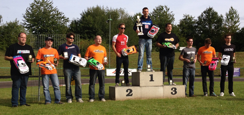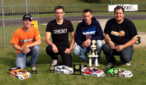 Die Pole-Position setzte Eric beim Start sogleich in die Führung um, gefolgt von Dirk, Dominic und Patrick N. Diese beiden jungen Fahrer schlossen zu Dirk auf und platzierten erfolgreich ihre Überholmanöver. Bei 4.40 Minuten bog Eric als Führender zum ersten Tankstopp in die Boxengasse ab. Damit war klar, daß er, da ihm noch keiner zum tanken folgte, einen Boxenstopp mehr als seine Konkurrenten zu absolvieren hatte. Die Tankstopps führten immer wieder zu Verschiebungen in der Rangfolge, speziell auch der notwendige Räderwechsel zu Rennhalbzeit. Als dieser absolviert war, lichtete sich der Nebel in der Rangliste. Dirk führte durch excellente Boxenstopps, Eric lag knapp zurück. Beide hatten sich einen größeren Vorsprung zum Rest des Feldes herausgefahren, der wohl bei normalem Rennverlauf nicht mehr aufzuholen war. Eric gab alles, er fuhr teilweise 2/10 tel schneller als Dirk. Eric schloss auf, überholte und setzte sich leicht ab. Es war ein sehenswerter Zweikampf dieser beiden Ausnahmefahrer. Dirk tankte bei 35 Minuten zum letzten mal und kam knapp hinter Eric wieder auf die Bahn. Wie vorher geschrieben, Eric mußte bei 38 Minuten nochmals zum Tankstopp, verlor die Führung an Dirk, setzte zum Endspurt an, aber es reichte nicht mehr. Dirk gewann mit ca. 2,9 sec. Vorsprung und wurde verdient Deutscher Meister. Hinter diesen beiden fighteten mit 2 Runden Rückstand Thilo und Patrick N. um den letzten Podestplatz, ein nicht minder spannendes Duell. Thilo rettete sich mit 1,4 sec. Vorsprung über die Ziellinie. Simon und Dennis vervollständigten mit Platz 6 und 9 das gute Ergebnis vom Team XRAY / ORCAN.
