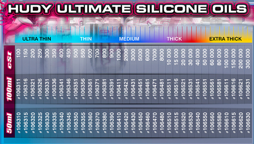 | | Eine optimale Abstimmung erfordert je nach Modell die unterschiedlichsten Öle. HUDY hat nun das wohl umfangreichste Sortiment an hochwertigen und temperaturstabilen Silikonölen im Programm, denn nicht weniger als 66 Varianten von 100 cSt bis hin zu 300.000 cSt warten auf den Einsatz. Zudem lassen sich die Öle untereinander mischen, um Zwischenstufen erzeugen zu können. Es sind folgende Versionen lieferbar, wobei grundsätzlich zwei Füllgrößen (50 und 100 Milliliter) erhältlich sind: