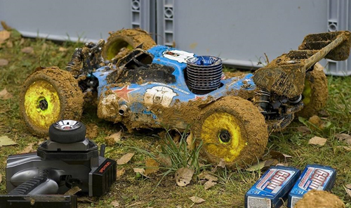 Im Finale der Verbrenner lief es dann für mich mit 3 Motorabstellern gar nicht gut, vermutlich hatte ich den Spritverbrauch auf dieser durchnässten Strecke unterschätzt sowie einmal einen Schlammbatzen an die Schwungscheibe bekommen. Steffen führte lange bis auch er 10 Meter vor der Boxengasse wegen Treibstoffmangel liegen blieb, sehr ärgerlich war daran auch das dies 5 Meter vor der Zeitschleife war! was bedeutet dass er nicht nur die Neustartzeit rausfahren mußte sondern auch exakt eine Runde! Trotzdem konnte er sich noch zurück auf den Zweiten fahren. Am Ende hieß es Christoph Quittel vor Steffen Schwarz und Ronny Schiffner.