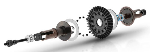 | | Der Einsatz auf rutschigem Untergrund führt mit herkömmlichen Kegeldifferenzialen oftmals nicht zum gewünschten Ergebnis. Das neue, von außen einstellbare, Kugeldifferenzial für den XB4 wird aus hochwertigem HUDY-Federstahl gefertigt und sorgt für Abhilfe bei Traktionsproblemen. Der Griff auf losem Untergrund erhöht sich und die rotierende Masse wird zudem verringert. Für eine lange Haltbarkeit verfügt das Kugeldifferenzial sowohl über ein Wolfram-Drucklager als auch über 2,4 Millimeter dicke Kugeln aus extrem harter Keramik. Die Montage wird zudem durch ein komplett ab Werk eingestelltes Differenzial beschleunigt.