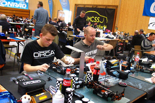 Am Samstagmorgen hatten die ca. 105 Fahrer die Gelegenheit sich und ihre Autos in 3 Trainingsläufen auf den Teppich und die Strecke einzustellen, bevor dann am Nachmittag die ersten 3 von 5 Vorläufen gefahren wurden. Für Valentin Hettrich und Tobias Vogel, die derzeit erfolgreichsten XRAY Fahrer aus dem SMI Team, lief es gleich von Anfang an sehr gut und auch der Smi- Nachwuchsfahrer Clemens Neubert kam super zurecht. Tim Wahl der für das XRAY Factory Team in Modified startete, lief es anfangs nicht so gut, er tat sich sichtlich schwerer mit der technisch sehr anspruchsvollen Strecke. Nach 2 weiteren Vorläufen am Sonntag ging es dann folgendermaßen in die Finale am Sonntagmittag.