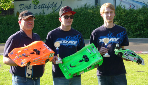 Den zweiten Xray-Sieg gab es in der HC10 (Hobby-Cup 1:10), die mit Einheitsmotoren von Novarossi und Sonic ausgefahren wird. Überraschenderweise ging die Pole-Position an Neuling Thorsten Lewandokwsi (AMSC Herne), der auch im Finale mit seinem Xray NT1‘2014 auf Siegkurs fuhr, bevor er nach 17 Minuten aufgrund eines defekten Riemens aufgeben musste. So übernahm sein Clubkollege Hans-Werner Dietz, Sechster nach den Vorläufen, die Führung und siegte schließlich souverän mit drei Runden Vorsprung. Ebenfalls auf dem Podium landete Xray-Pilot Florian Trapp (RC-Car Shop Race Crew), der mit seinem NT1 vor Markenkollege Sures Velauthapillai (MCK Dormagen) Dritter wurde.