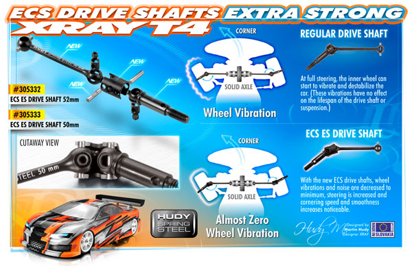 | | Beim Einlenken mit einer herkömmlichen CVD-Welle kann das kurveninnere Rad bei sehr hohen Einschlagwinkeln in Schwingung geraten. Dies verhindert ein schnelles Durchfahren der engen Kurve und verringert die Rundenzeit. Die neuen, extra verstärkten ECS-Wellen verfügen über zwei hintereinander liegende CVD-Gelenke, um diese Schwingung zu eliminieren.