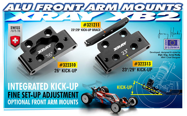 | | Der Kick-Up der Vorderachse des XB2 kann nun nicht nur über die austauschbaren Querlenkerhalter auf 23, 26 oder 29 Grad festgelegt werden, sondern wahlweise kann auch das Gewicht mit Messingteilen erhöht werden, um das Modell besser auf die Strecke abstimmen zu können. Daher präsentiert XRAY die nachfolgenden Varianten sowohl aus Aluminium als auch aus Messing:
