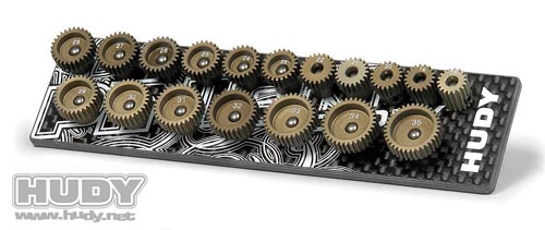 | | Klein, leicht und stabil präsentiert sich die Halterung aus Kohlefaser für bis zu 18 Motorritzel. Bei diesem Set sind bereits 18 Stück 48DP-Ritzel von zwölf bis 29 Zähnen enthalten. Natürlich sind alle Ritzel aus hochwertigem Aluminium gefertigt und haben eine gehärtete Oberfläche für erhöhte Haltbarkeit.