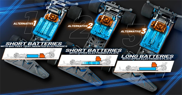 • Floating battery holder system on rear aluminum bulkheads ensure precise mounting which doesn´t impact chassis flex, and quick battery installation & removal