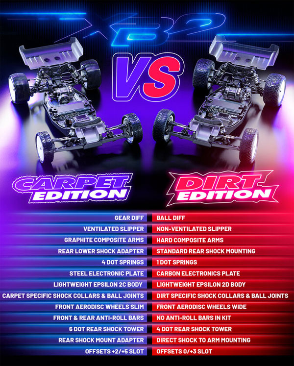 • All-new 2.5 mm chassis lineup with optimized flex — mid-size for carpet, short-size for dirt — engineered for maximum traction and control
