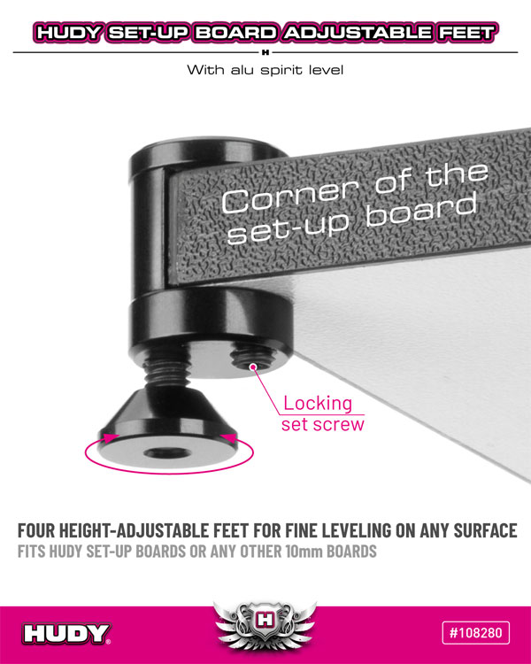 Der mitgelieferte Hebel mit Libelle dient als Führung für die Verstellung der Füße. Die Füße sind mit allen HUDY-Einstellplatten kompatibel. Sie sind schwarz eloxiert und Lasergraviert und bieten so ein sauberes und funktionales Erscheinungsbild.