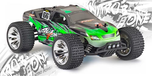 Fahrfertig aufgebauter Nitro Truck "Nitro Bone Pro" • 3 Kanal Pistolengriff Fernsteuersystem 40 MHz FM (Sender, Empfänger, 2 bereits montierte Servos , Ein Aus Schalterkabel, Quarze) • bedruckte Karosserie mit Dekorbogen.