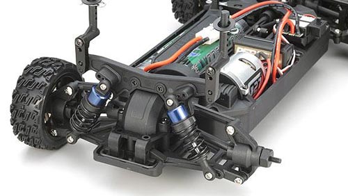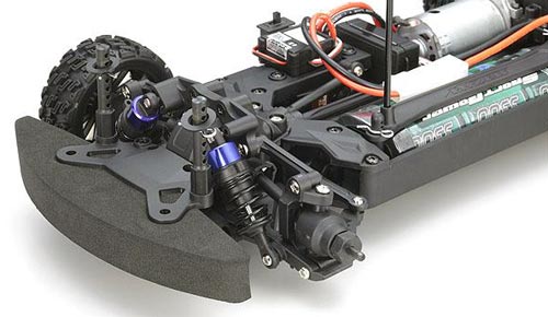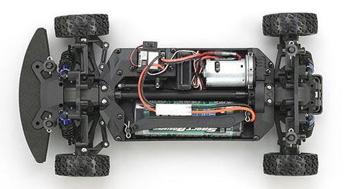 Das Wannenchassis ist aus glasfaserverstärktem Kunststoff gefertigt und bildet die verwindungssteife Basis des Elektro-Boliden. Die Aufnahme für den Akku ist so ausgelegt, dass wahlweise herkömmliche NiMH-Stick-Packs oder die wesentlich leistungsstärkeren LiPo-Car-Akkus eingesetzt werden können.