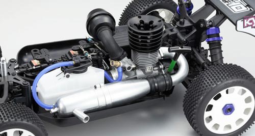 Ein Verbrennungsmotor vom Typ GX-21BK mit Seilzugstarter und passend abgestimmtem Schalldämpfer ist im ReadySet enthalten. Sein schwarz eloxierter Zylinderkopf verfügt über ein neues Design, das für eine schnellere Wärmeabfuhr und somit für eine konstante Leistungsentfaltung sorgt. Im Modell sind der Empfänger KR-1NBK sowie die Hochleistungs-Servos KS-102BK fahrfertig montiert. Als Schnittstelle zwischen Fahrer und Buggy dient die bewährte Fernsteueranlage KT-6. Eine neu gestaltete aerodynamische Karosserie mit schickem Farbdesign rundet das Gesamtpaket des Inferno NEO ab.