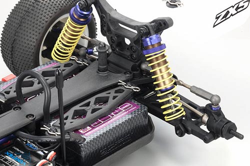Die Vorderachse stammt aus dem bewährten ZX-5 SP und verfügt über die optimierten Querlenker und Radträger. Die Spurstangen und oberen Querlenker sind aus Molybden gefertigt und besitzen an beiden Achsen die gleiche Länge.