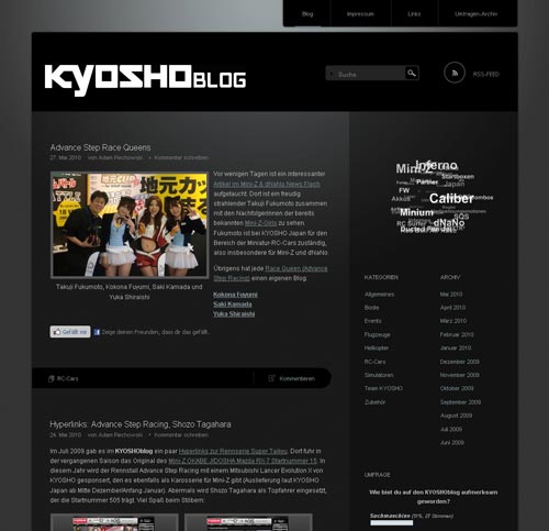 | | Am 8. Juni 2010 ist es so weit: Der KYOSHOblog wird ein Jahr alt! Mittlerweile ist auf dieser Plattform eine Vielzahl von Artikeln zu finden, in denen die Firma KYOSHO im Fokus steht. Eines der wesentlichen Ziele bei diesem Projekt ist und bleibt, interessierte Leser nicht mit Marketingtexten und massiver Werbung zu überschütten. Vielmehr fungiert das Portal als Anlaufstelle für Fans von KYOSHO-Produkten, um Hintergrundinfos rund um die Firma und teilweise direkt aus Japan anzubieten. Zudem wird durch die Kommentar-Funktion eine weitere Schnittstelle zwischen KYOSHO, Fachhändlern, Endkunden und Interessierten aufgetan. Ein komfortabel und kostenlos abrufbarer RSS-Feed rundet das informative Angebot ab.