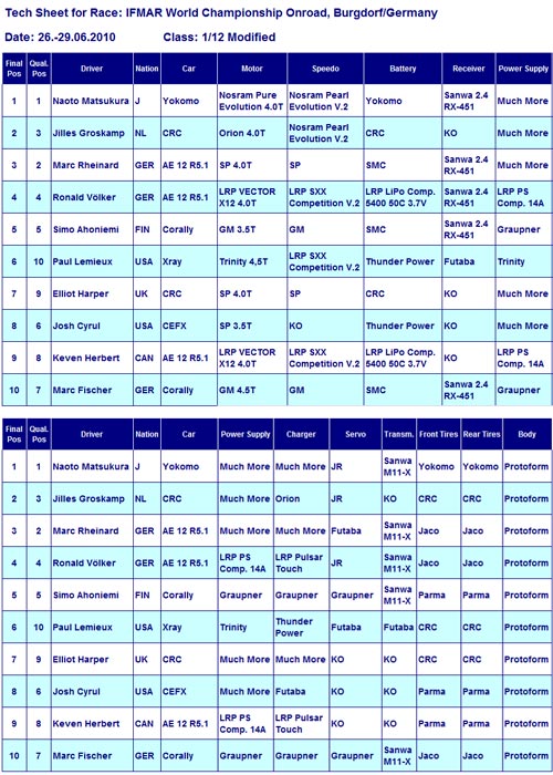Den Start machte die Klasse 1/12 Modified. Mit von der Partie war LRP Top-Fahrer Ronald Völker (Deutschland), der neben Marc Rheinard (Deutschland) und Titelverteidiger Naoto Matsukura (Japan) als Favorit auf den Titel 2010 galt.