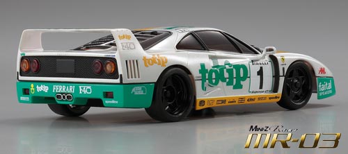 | | Kyosho stellt mit dem Mini-Z MR-03 Ferrari F40 Totip 1994 einen weiteren neuen Mini-Z-Racer im Maßstab 1:24 vor. Für dieses Modell wurde das MR-02-Chassis als Grundlage überarbeitet und zum MR-03 revolutioniert. Es besitzt durch die komplett neu entwickelte Vorderachse eine noch höhere Fahrdynamik als sein Vorgänger, ist deutlich schmaler und hat zudem einen tieferen Schwerpunkt. Dies resultiert in spürbar höheren Kurvengeschwindigkeiten und einem sehr agilen Fahrverhalten. Durch die Funktechnologie in 2,4 GHz können insgesamt bis zu 40 Modelle gleichzeitig betrieben werden. Die Lieferung erfolgt ohne Sender. Für den Betrieb ist ein KYOSHO Perfex KT-18 (Artikelnummer 82001) erforderlich. Ins Mainboard des MR-03 ist ein FET-Regler integriert, der den Elektromotor sehr feinfühlig ansteuert. Zudem verfügt es serienmäßig über ein ICS-Interface. Mit einem speziellen USB-Kabel und einer Software (nicht im Lieferumfang enthalten) lässt sich das Chassis per PC/Notebook konfigurieren. Das Setup des Fahrzeugs ist somit komfortabel auf der Festplatte Speicher bar. Für die Umsetzung der Lenkbefehle sorgt ein Digitalservo mit Coreless-Motor und einer Getriebeübersetzung von 94,41:1. An die Regler-Empfänger-Einheit RA-22 kann optional der Gyro MZW-405 angeschlossen werden, um die Fahrstabilität zu erhöhen. Die Vorderräder sind einzeln aufgehängt und mit gefederten Doppelquerlenkern versehen. Die Hinterachse basiert auf bewährten MR-02-Komponenten. Sie ist mit einem Kegelrad-Differential versehen und als gefedertes Powerpod ausgelegt. Es liegen ein Satz Werkzeug sowie vier verschiedene Motorritzel zur Feinabstimmung des Antriebs bei.