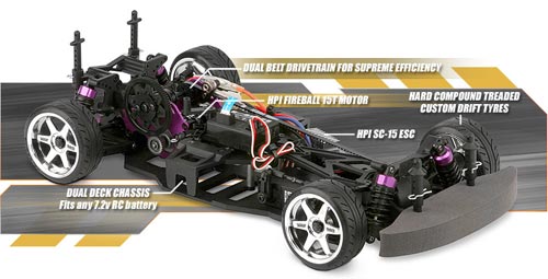 - Inklusive hochwertiger Elektronikkomponenten: HPI SF-1 Lenkservo, elektronischer SC-15 Regler und Firebolt 15-Turn Motor.