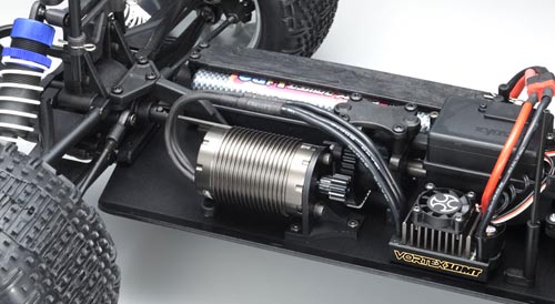 Der DMT VE wird als ReadySet mit dem bewährten Perfex KT-6 Fernsteuersystems geliefert. Das Herzstück des DMT VE ist der Team Orion Vortex Brushless Antrieb, der dem Modell auch seinen Namenszusatz VE verleiht. Der Team Orion Vortex 10 Motor verfügt über eine feine Verrippung zur perfekten Wärmeableitung. Die Ansteuerung des Motors erfolgt durch den brandneuen Team Orion Vortex Experience 10MT Regler, der speziell für Modelle im Maßstab 1/10 konzipiert worden ist. Der Regler verfügt über einen großzügig dimensionierten Lüfter, der während des Fahrbetriebs permanent aktiv ist. So werden unerwünschte Temperaturspitzen an den elektronischen Bauteilen wirksam vermieden. Der Vortex Experience Regler verfügt über die Funktion vorwärts - Bremse - rückwärts und eine automatische Erkennung der Zellenzahl mit Unterspannungsabschaltung zum Schutz der LiPo-Zellen. Das Modell kann wahlweise mit einem 2s LiPo-Pack oder alternativ mit 6-7 Zellen NiMH betrieben werden.