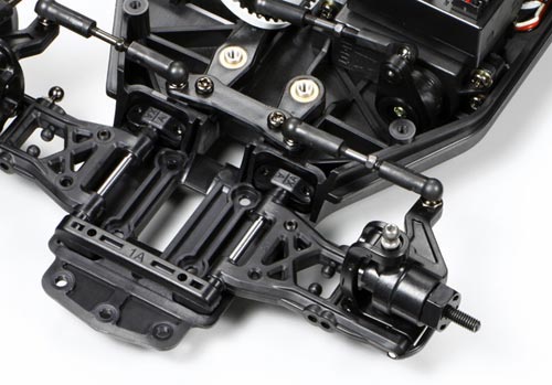 | | Das limitierte Tamiya Bausatzmodell zeigt den Mach GO GO GO Shaken 408R auf dem TA05 Ver.II Chassis in bester Tamiyamanier. Viele Details und mit dem Dekorbogen lässt sich ein perfektes Abbild aufbauen. Unter der ultraflachen Karosserie verricht das überarbeitete Wettbewerbschassis TA-05 Version II seinen Dienst. So verbessern das nun schmalere Chassis und der weiter vorne positionierte Akku die Fahrcharakteristik deutlich. Der permanente Allradantrieb sorgt für Traktion und Vortrieb auf allen Rennstrecken.