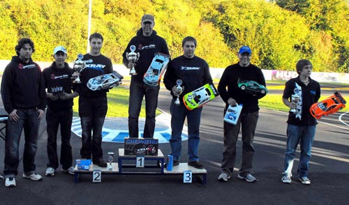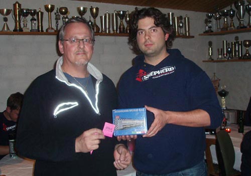 Nach den zwei Quali-Durchgängen wurde die Bahn nochmals zum freien Training geöffnet, bevor zum gemütlichen Teil übergegangen wurde. Shepherd Micro Racing hatte alle Fahrer zu einem leckeren Buffet eingeladen. Der MSC Kirchhain hatte noch ein extra Zelt aufgestellt um für alle Teilnehmer, Mechaniker und Gäste genügend Platz zu bieten. Nach dem Essen wurden die Sachpreise verlost. Insgesamt standen über 50 Sachpreise mit einem Gesamwert von ca. 1700 € bereit, die Hauptpreise waren ein Boxengassen Trolley im Wert von 169,- € und ein Novarossi Flash.21Special 3,5ccm Motor im Wert von 575,- €. Der glückliche Gewinner des Flash Motors war Jean-Pierre Galot.