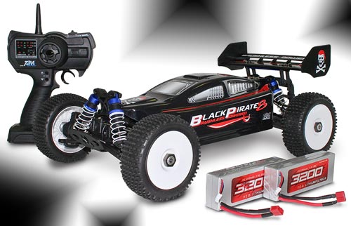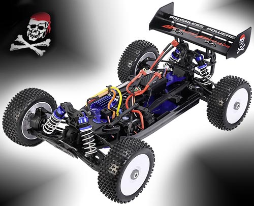 | | Erlebe die Powerkombi aus Brushlessantrieb und LiPo-Akkus! Der Black Pirate 8 ist mit einem leistungsstarken 6T Brushlessmotor ausgestattet, der für eine atemberaubende Geschwindigkeit und Beschleunigung sorgt, die sogar Verbrennermodelle in den Schatten stellt. Zur Serienausstattung gehören zwei 7,4 V/3200 mAh LiPo-Akkus, die für eine ausgeglichene Balance seitlich vom Antriebsstrang liegen, sie versorgen den Buggy mit Power für extralange Rides. Die Fahrwerkskomponenten überzeugen sofort: Gewinde-Öldruckstoßdämpfer, Spur/Sturz über Gewindestangen einstellbar, Alu-Achsschenkel vorne oder Dämpferbrücken mit Multi-Befestigungspositionen sind nur einige der vielen High Tech-Merkmale. Gesteuert wird der Black Pirate mit einem störungsfreien 2,4 GHz RC-System.