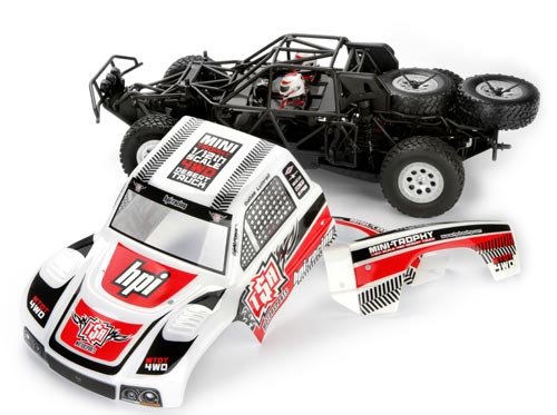 Das TSA Team baut ihren neuen Truck für die 7200er Klasse, bei dem Truck handelt es sich um eine verkleinerte Version eines Trophy Trucks, in Richtung eines Mini-Trucks, der einmal ein 4-Zylinder Pickup Truck war. Die meisten "Mini-Trucks" heutzutage sind nicht mehr wirklich so "mini" und haben einen 6-Zylinder Motor. Aber im Vergleich zu einem 6.000+ lbs / 800 PS Trophy Truck, ist die 7200er Klasse wirklich nur für einen "Mini-Trophy" gedacht. TSA verwendet einen Ford 6-Zylinder HESCO Motor. HPI machte den "Mini-Trophy" Spitznamen und beschloss den neuen (1:12) 4WD Desert Truck genauso zu benennen.