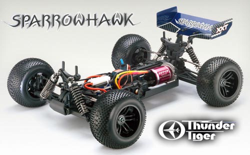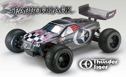 | | „Brushless System Inside!“ Jetzt ohne Sender & Empfänger! Die Fachpresse war in ihren Tests bereits vom Sparrowhawk XT in der aktuellen 2010er Version hellauf begeistert. Ein Elektro- Truggy der Spitzenklasse, der durch sein geniales Fahrwerk, seine konsequente 4WD Technologie und Stabilität, die aus dem harten Verbrenner Bereich adaptiert wurden, überzeugt und bei Verwendung von konventionellen Bürsten-Motor Antrieben noch nicht einmal annähernd an seine Leistungsgrenzen gebracht werden kann. Jetzt hat Thunder Tiger nachgelegt und den Sparrowhawk in der XXT Version serienmäßig mit seinem hochmodernen RIPPER Brushless-System ausgerüstet. Maximale Effizienz, atemberaubende Top-Speed und gigantische Drehmoment-Reserven machen aus dem neuen Sparrowhawk XXT einen Truggy mit permanenten 4WD Allradantrieb, der ein einzigartiges Leistung zu Gewicht Verhältnis aufweist und dadurch zu einem Truggy mit purem Sportwagen Feeling mutiert ist.