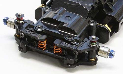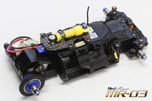 Die Vorderräder sind einzeln aufgehängt und mit gefederten, doppelten Querlenkern versehen. Die High-Grip-Niederquerschnittreifen verleihen dem MR-03-Racer kompromisslose Traktion. In Verbindung mit dem extrem niedrigen Schwerpunkt wird eine atemberaubende Fahrdynamik erzielt, die bei Modellen dieser Größe noch nie zuvor erreicht worden ist.