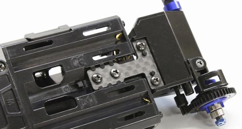 Die Hinterachse des MR-03-Chassis basiert auf bewährten MR-02-Komponenten. Durch das gefederte Powerpod ist das Chassis sehr flexibel und passt sich jeder Fahrbahnsituation optimal an. Die Antriebsakkus liegen nebeneinander im Modell, wodurch der Massenschwerpunkt sehr niedrig ist.