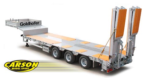 Wir nehmen alles Huckpack..... Passend für alle Tamiya Zugmaschinen präsentiert Carson den Goldhofer Sattelanhänger BAU STN-L 3 (mit Plateau). Die geteilte Rampe ist zum Befahren per Hand ab klappbar. Der Auflieger ist mit drei zwillingsbereiften Achsen ausgestattet. Das Fahrwerk ist mit Luftfederattrappen aufgehängt. Der CNC- gefräste Rahmen besteht aus Aluminium. Alle Stützen sind mechanisch verstellbar. Die 4-Kammer Rückleuchten sind elektrisch nachrüstbar.