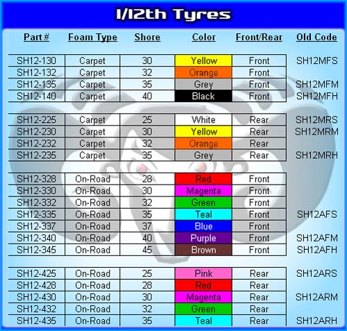 | | Nach ausgiebigen Tests ist Shepherd Micro Racing stolz darauf Reifen für Pancar Modelle im Maßstab 1/12 präsentieren zu können. Die schwarze Felge zeichnet sich durch eine optimale Steifigkeit aus und garantiert ein optimales Handling. Um den richtigen Reifen für die unterschiedliche Bahnbelage und Teppiche zu finden, sind zusätzlich Shore-Härten verfügbar. Zudem haben die Reifen jetzt auch einen Farbcode, um die Identifizierung zu Vereinfachen, komplizierte Ersatzteilnummern gehören der Vergangenheit an.