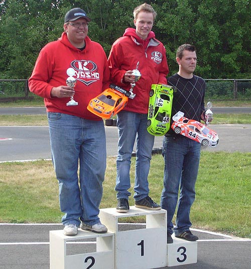 Aus den Halbfinalen konnten beide problemlos in das Finale aufsteigen und auch Bernd Rausch ließ sich das Finale nicht nehmen. Im Finale sollte sich dies wiederholen, was bereits in den Vorläufen zelebriert wurde. Souverän drehten Chrissi und Ralf mit ihrem Team Orion gepowerten V-One R4 ihre Runden und fuhren mit nur 4 Sek. Abstand untereinander einen Doppelsieg für das Team KYOSHO und den V-One R4 ein. Carsten Steinhäuser belegte mit drei Runden Differenz Platz 3. Die Finalplatzierungen für das Team KYOSHO komplettierte Bernd Rausch auf Platz 5.